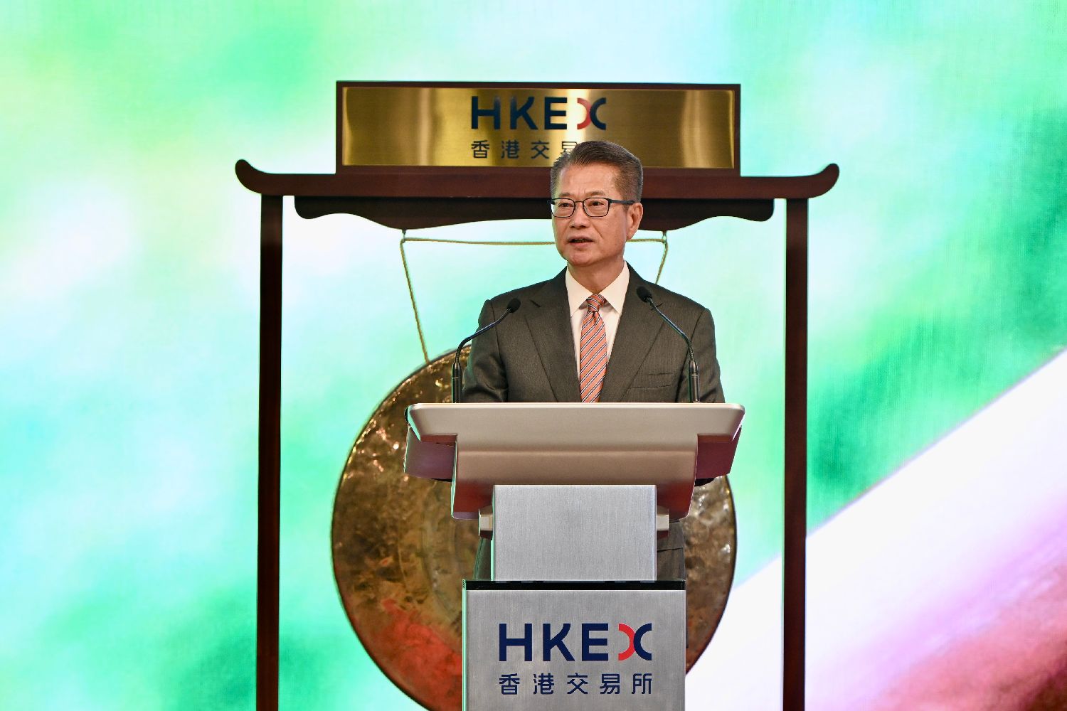 目前已获批的双柜台证券共24只,约占港股总成交额的40%。图为香港特区政府财政司司长陈茂波致辞。