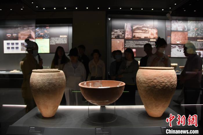 5月18日拍摄的馆藏网弦纹陶罐和陶盆。(图片来源:中新网)