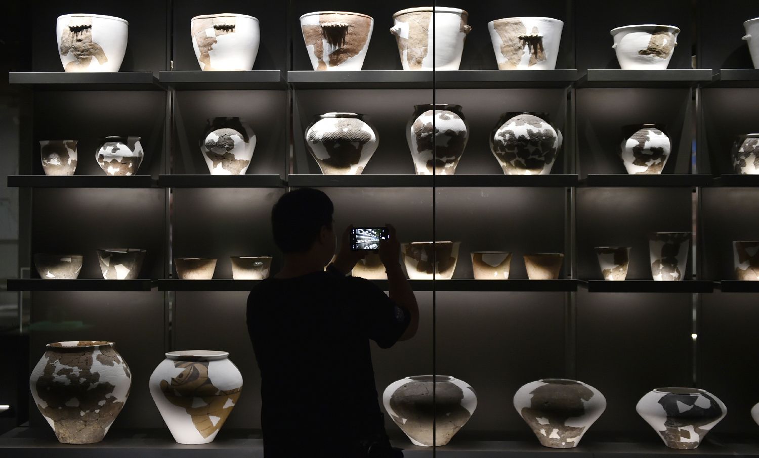 6月22日,参观者在三门峡庙底沟博物馆内参观拍照。(图片来源:新华社)