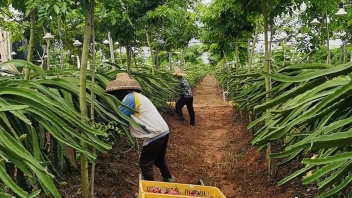 位于儋州市中和镇的水井岭水果种植基地,工人们穿梭其中,忙着采收火龙果。海南金通农业开发有限公司总经理王有志介绍,该基地作为桉树林地改良种植水果试点项目,已完成投资1.3亿元,种植水果面积约2100亩,其中火龙果1600亩、沃柑450亩。