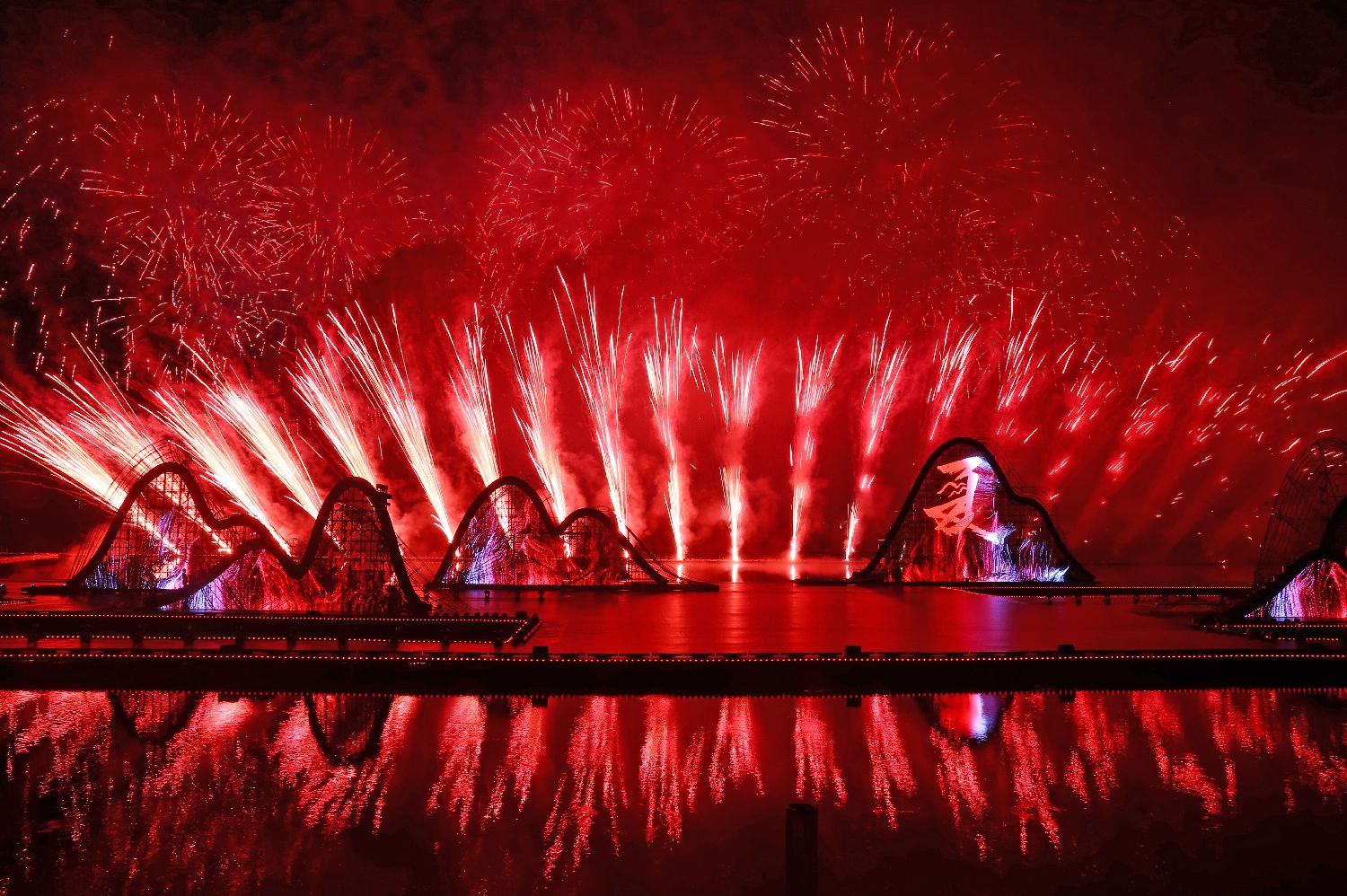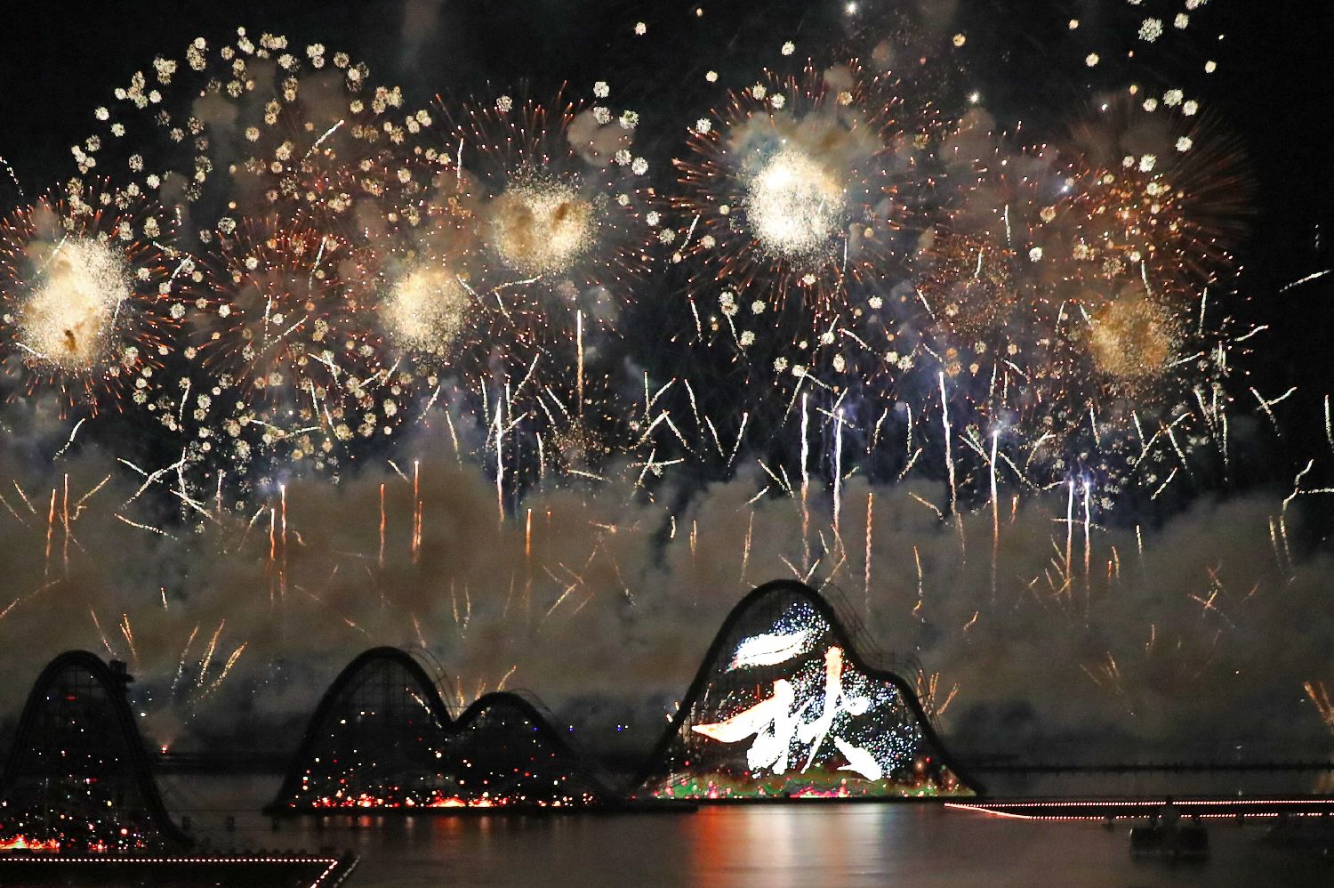 当晚的烟花文艺晚会分为秋《千年之间相生》、冬《山水之间相融》、春《你我之间相遇》、夏《天地之间相拥》等多个篇章,近8万发烟花一次次在夜空绚丽绽放,为现场观众带来一场震撼的视听盛宴。图为绚丽的烟花在夜空中绽放。(图片来源:中新网)