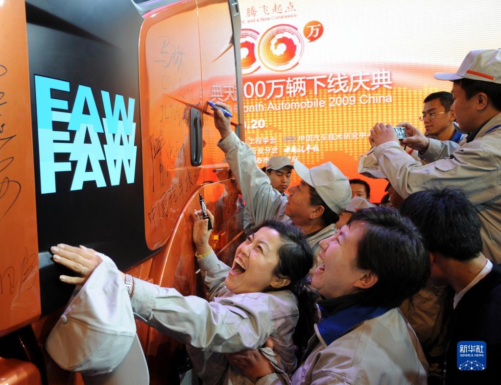 2009年10月20日,2009年第1000万辆汽车在长春一汽诞生。中国成为继美、日之后第三个汽车年产破千万辆的国家,进入千万辆汽车大国行列。这是一汽解放的工人们在自己亲手生产的2009年中国第1000万辆车上签名。(图片来源:新华网)