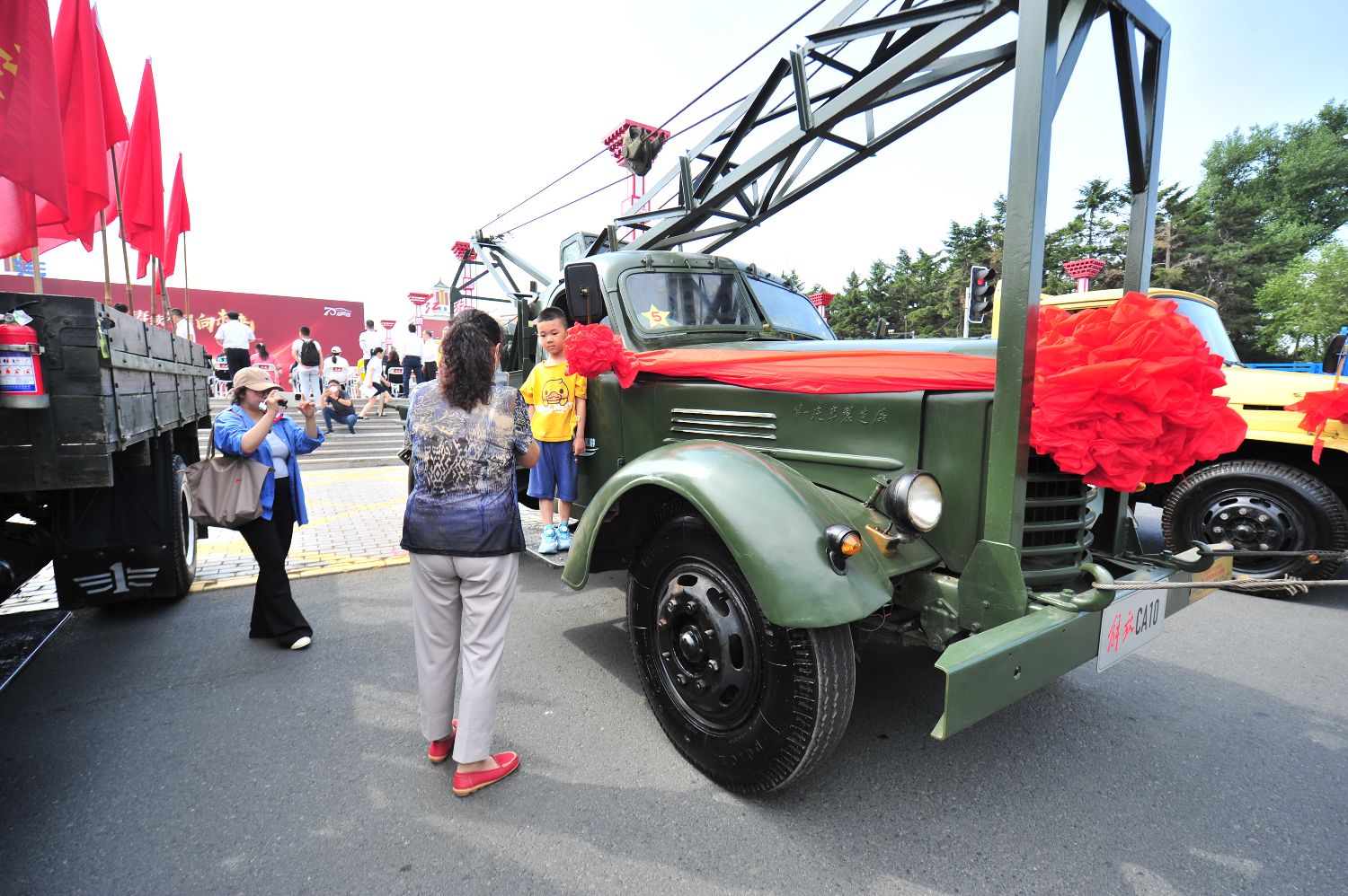 6月26日,吉林长春,市民在参观第一代解放牌卡车。(图片来源:中新社)