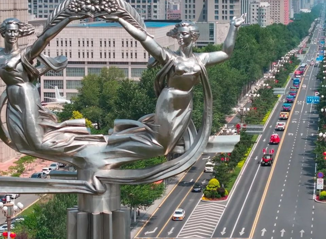 巡游车队行径卫星广场。(图片来源:央广网发/一汽解放供图)