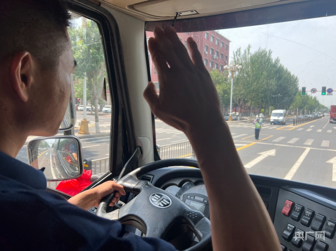 车队司机与路面交警相互致敬。(图片来源:央广网发/一汽解放供图)