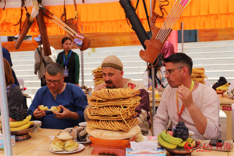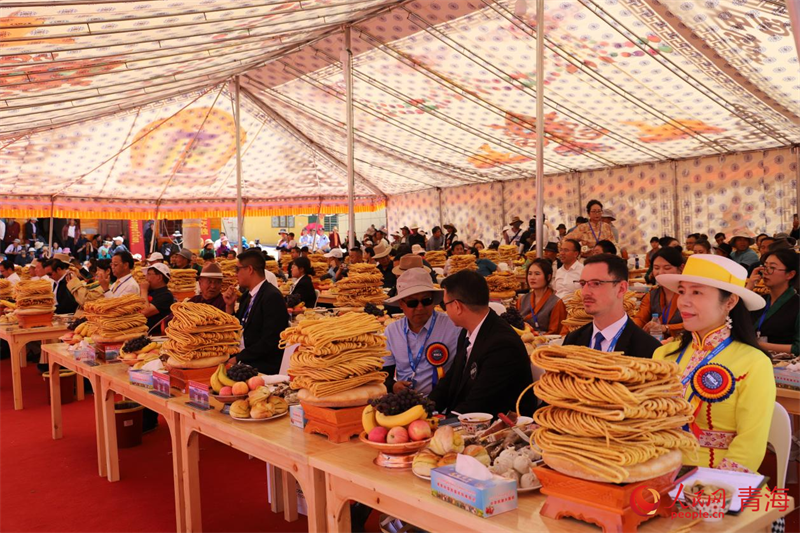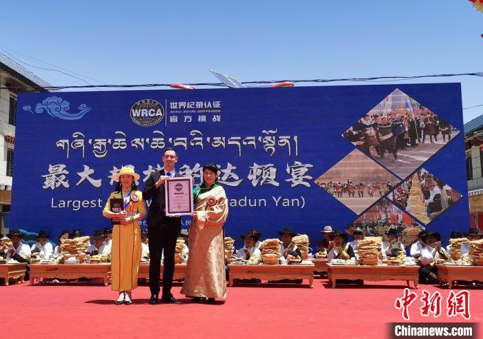 6月25日,2023第七届“五彩神箭”国际民族传统射箭邀请赛暨达顿文化活动在尖扎县举行。图为“最大规模的达顿宴”认证现场。(图片来源:中新网)