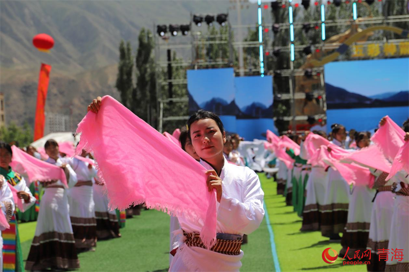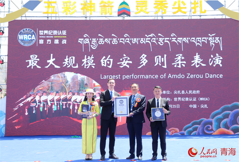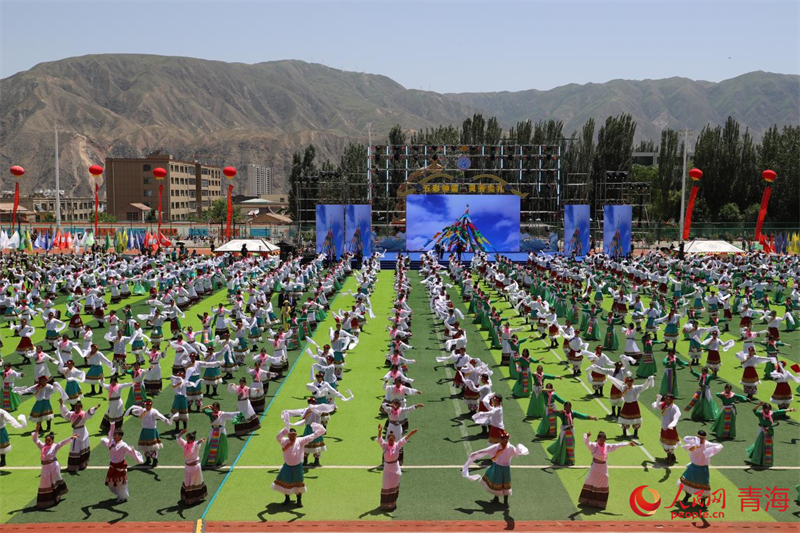 2023第七届“五彩神箭”国际民族传统射箭邀请赛暨达顿文化活动在尖扎县举行。由1370名舞者在同一场地表演的安多则柔被世界纪录认证机构(WRCA)认证为最大规模的安多则柔表演。(图片来源:人民网)