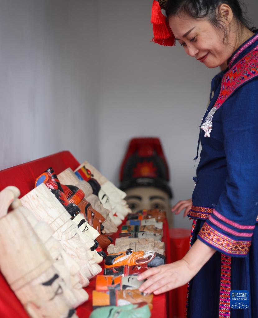 在广西环江毛南族自治县下南乡毛南民族文化园,身着毛南族服饰的妇女观赏毛南族傩面具。(图片来源:新华网)