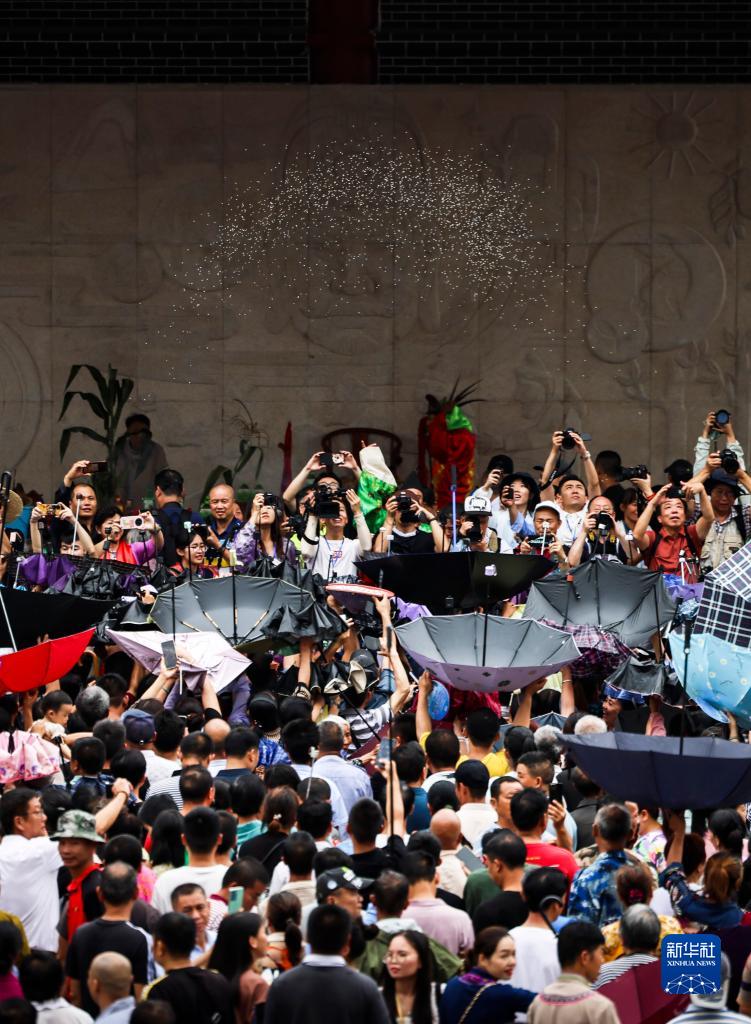 村民用雨伞接“福禄寿米”祈福。(图片来源:新华网)
