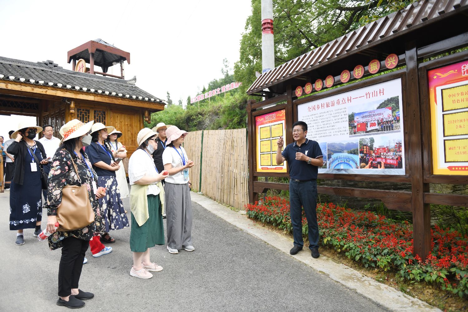 《爱在竹山》沉浸式体验景区、苗岭无边界温泉泳池、星空露营基地、竹山乡居民宿……2019年以来,竹山村引进的凤凰旅投开发建设集团有限公司创新打造了一系列特色休闲度假产品,实现“村在景中,村因景更美”。图为19国海外华文媒体代表走访竹山村。