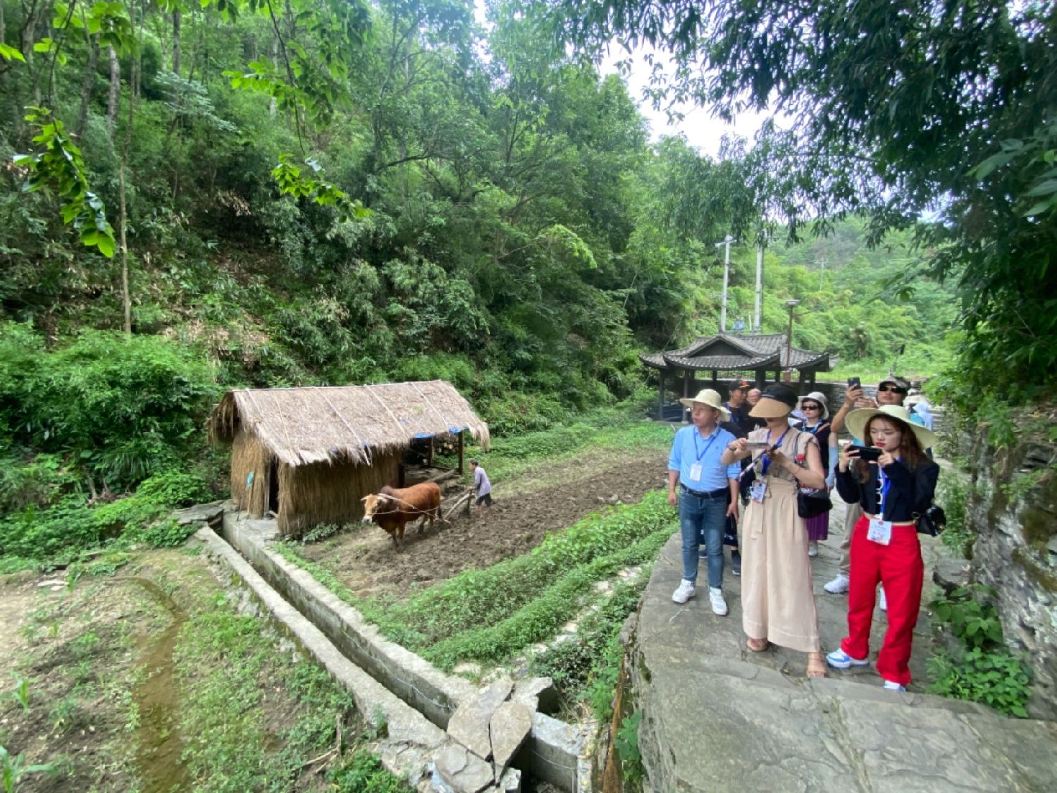走进竹山苗寨,就进入了一个沉浸式体验景区,村民们的日常生活就是旅游“场景”,村民吴国安在村口不远处的田地里赶牛犁田,一幅“传统农耕图”映入眼帘。图为海外华文媒体代表在竹山村走访。
