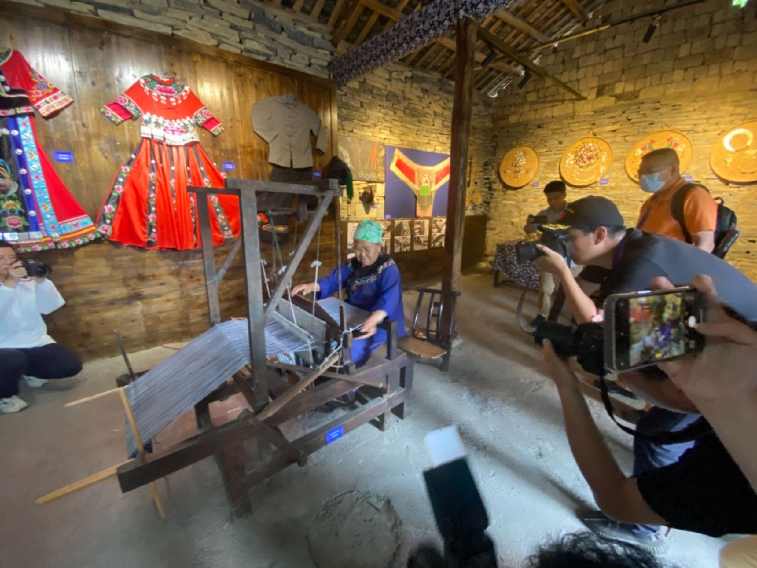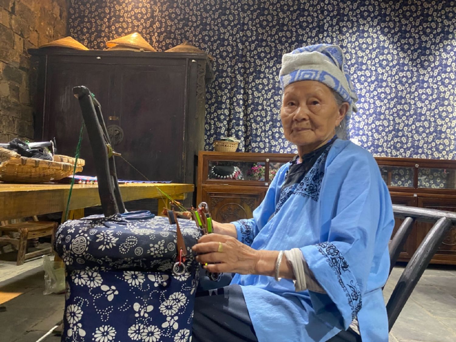 93岁的龙妹叭是苗族花带编织非遗文化传承人,也是竹山村沉浸式体验景区里年龄最大的“演员”。打了一辈子苗族花带的她,仍眼不花、手不抖,如今在村里的苗绣堂向游客展示这门非遗技艺。