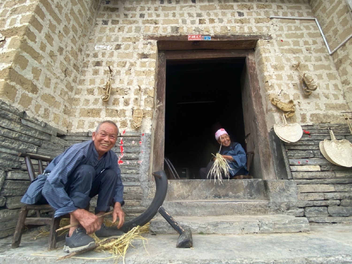 耄耋老夫妻在家门口编织草鞋、凉扇,来客若有喜爱心意带走留念,可以向老婆婆要二维码扫码给一点手工费。