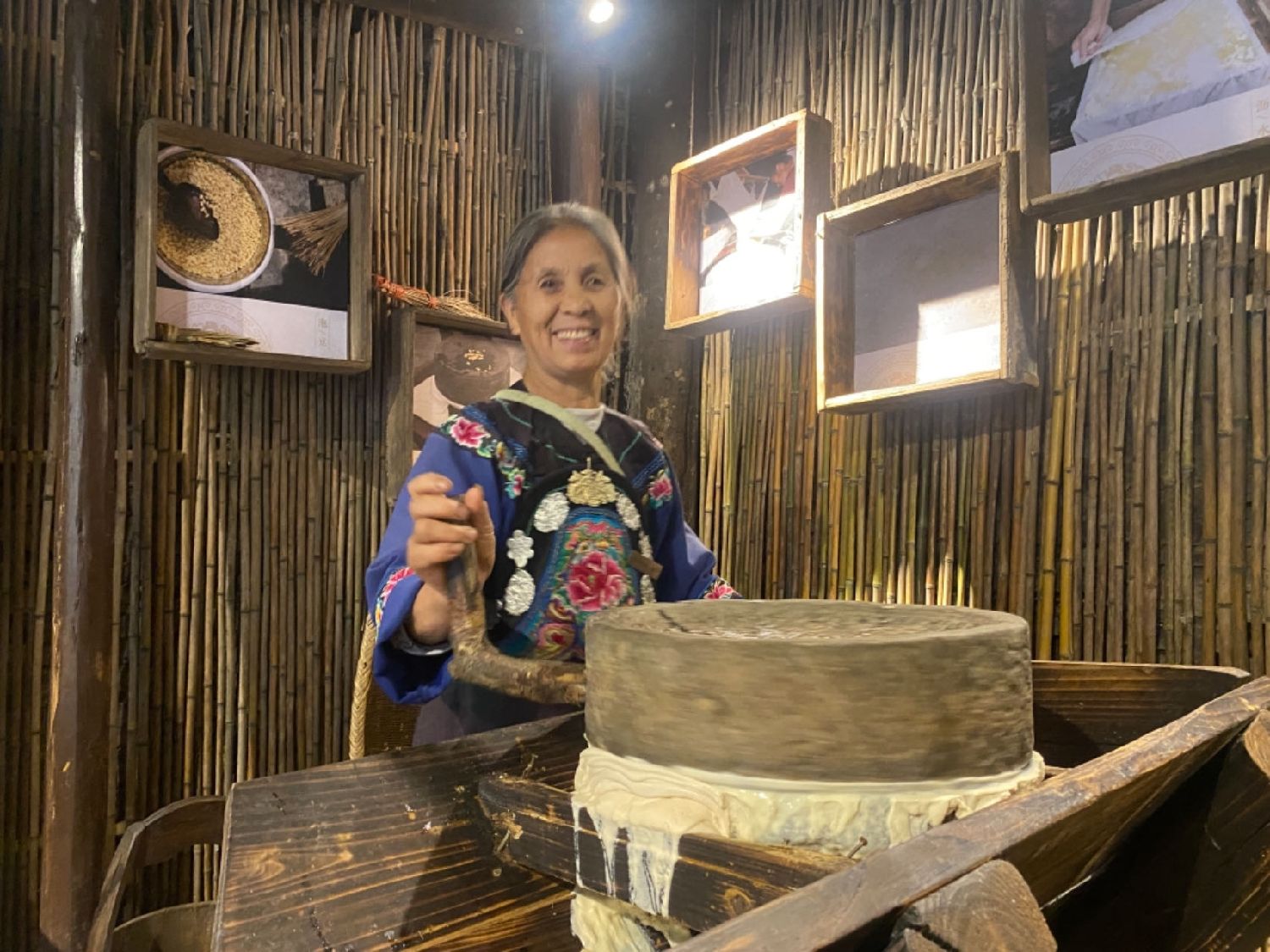 除了薪金,村民还能通过房屋租赁、土地流转获得租金。图为竹山村里的生活坊里,村民磨豆浆给游客品尝。