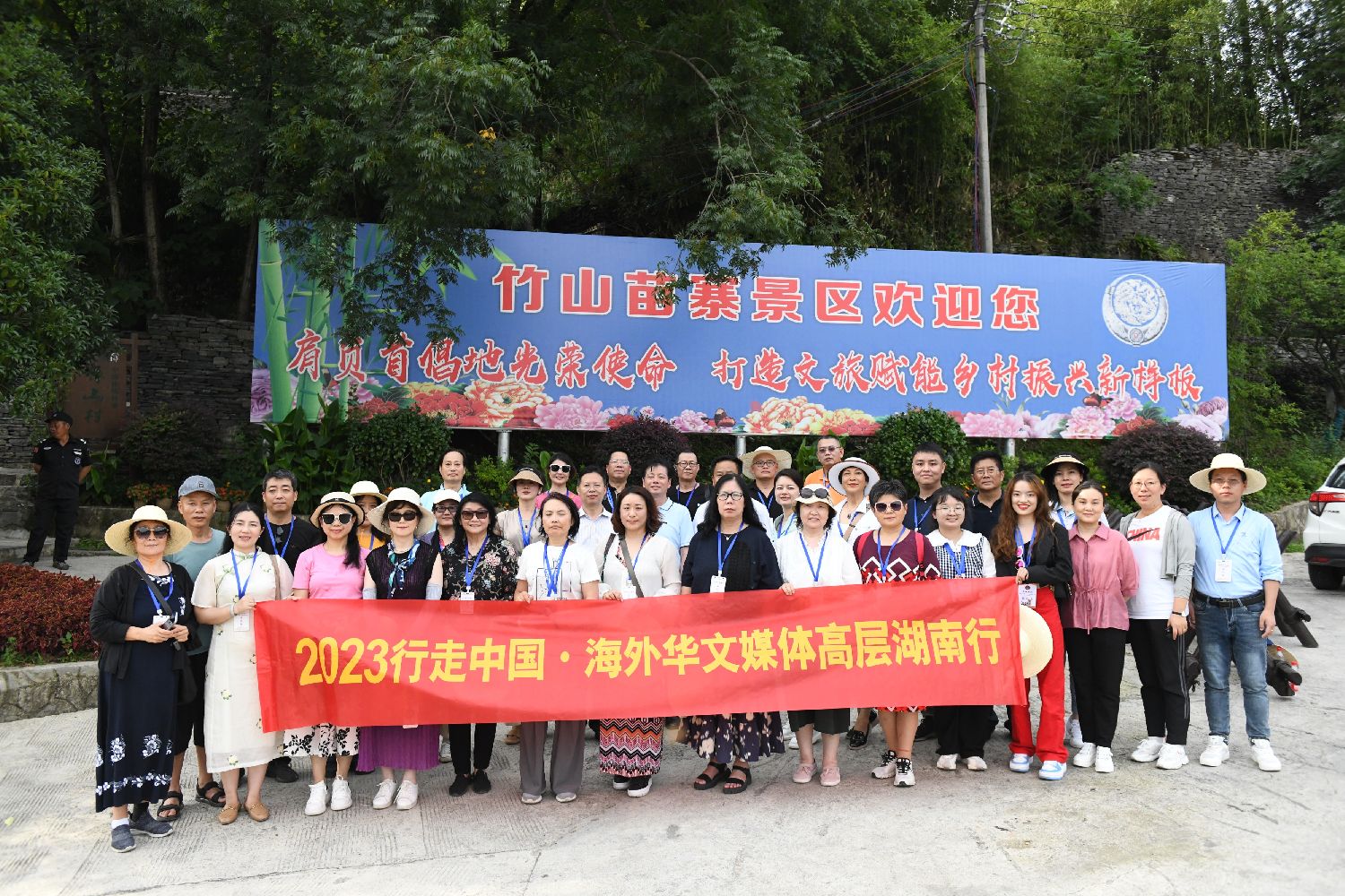 图为海外华文媒体在竹山村村口合影留念。