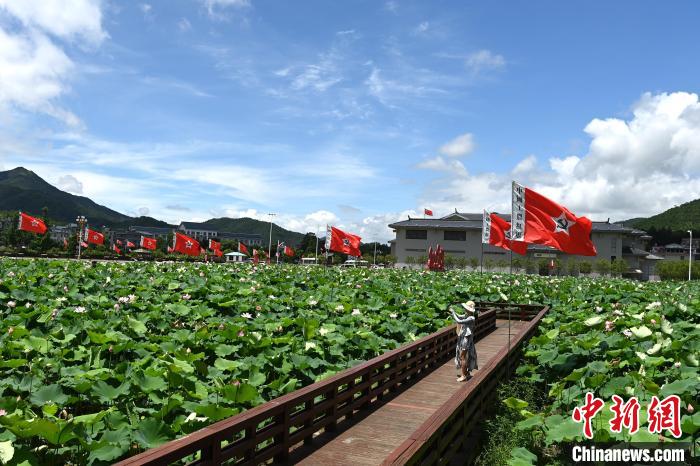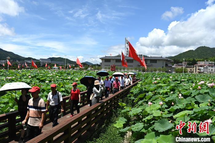 福建省龙岩市上杭县才溪镇将开发红色文化旅游和小城镇建设相结合,开辟100多亩的红军公田,并根据当地自然条件和作物生长规律,种植荷花、向日葵等作物,形成景区四季不同景的田园风光,成为上杭县继古田会议旧址景区之后又一个人气旺盛的红色景点和乡村旅游胜地。图为6月29日,才溪镇“红军公田”百亩荷花盛开,吸引不少游客前来观赏。(图片来源:中新网)