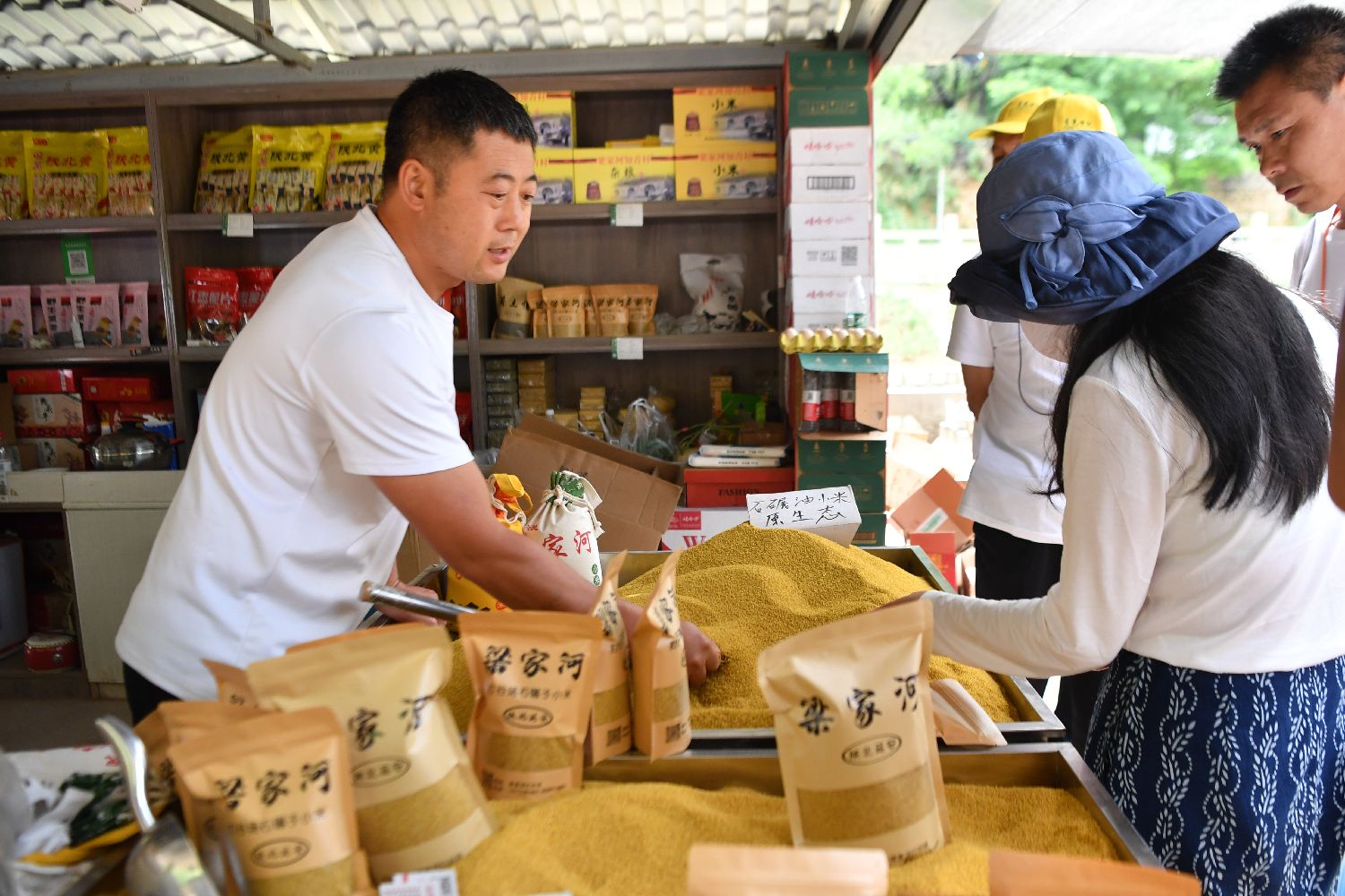 6月28日,游客在延安市延川县文安驿镇梁家河村选购农产品。