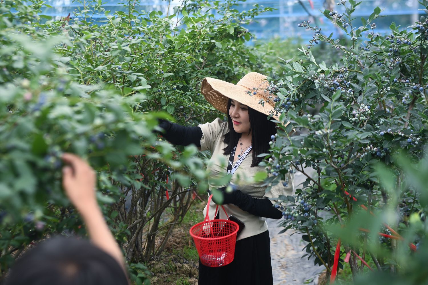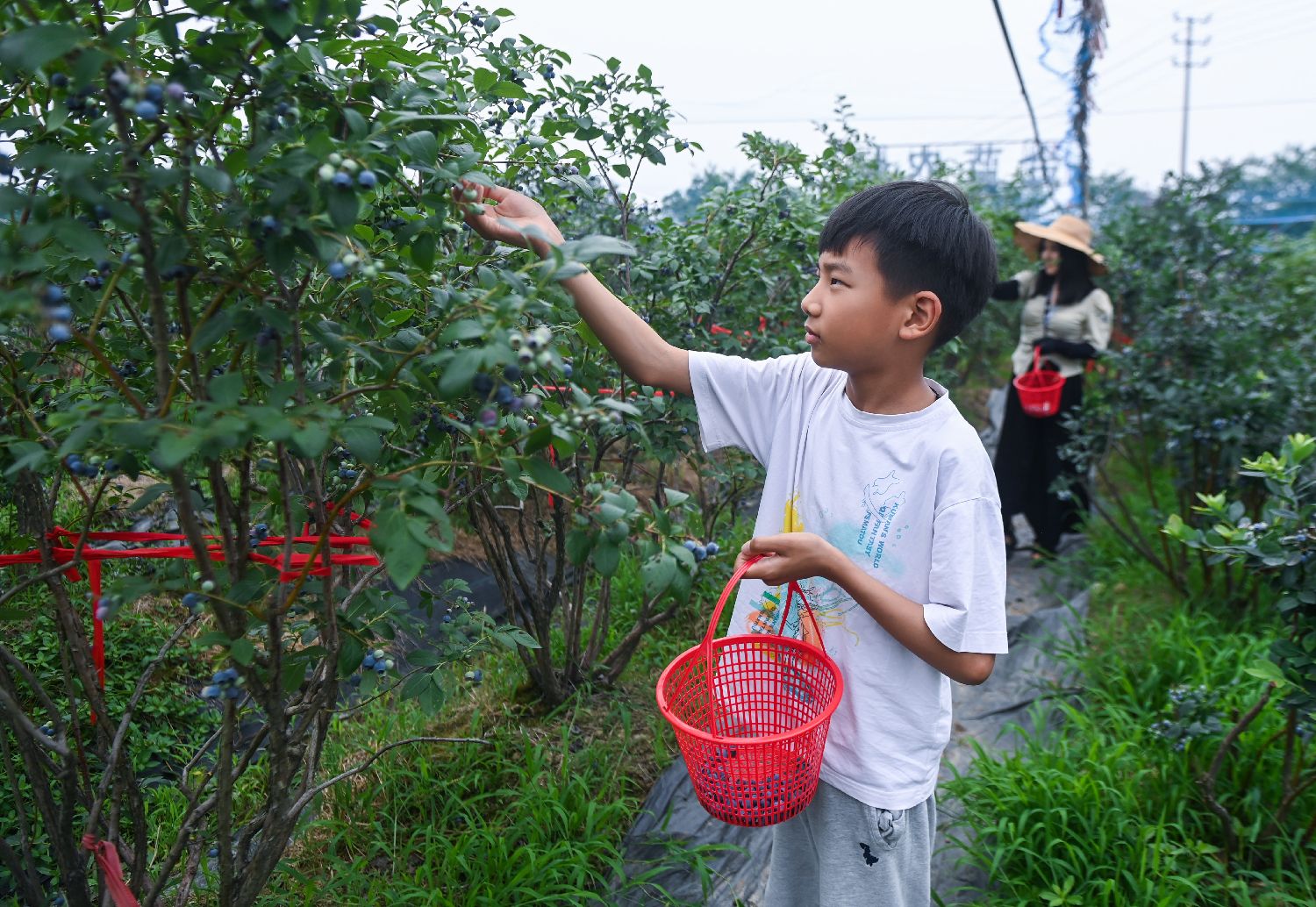 入夏后,浙江省湖州市长兴县虹星桥镇一万多亩精品果园内的蓝莓、小番茄、西瓜、黄桃等陆续进入成熟采摘期。当地依托现代农业资源,开启农园新景休闲采摘旅游文化节,发布蔬果采摘、渔文化等研学线路,吸引游客前来,助力特色乡村旅游发展。图为6月3日,在位于长兴县虹星桥镇谭家村的金蓝家庭农场的蓝莓种植区内,游客采摘成熟的蓝莓。