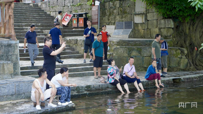 广西柳州市鹿寨县中渡古镇林木郁郁葱葱,湿地水草丰茂,洛江清澈见底,吸引了许多游客前来观光、避暑、休闲、度假。图为游客在中渡古镇避暑(图片来源:央广网)