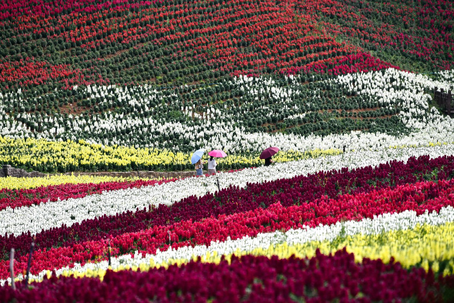 贵州省黔东南苗族侗族自治州麻江县宣威镇春夏季种植金鱼草、薰衣草,秋冬季种植菊花等花卉,形成集种植、加工、销售和农业观光旅游为一体的花卉产业,以花为“媒”带动乡村旅游,助力乡村振兴。图为5月17日,游客在贵州省麻江县宣威镇药谷江村赏花。
