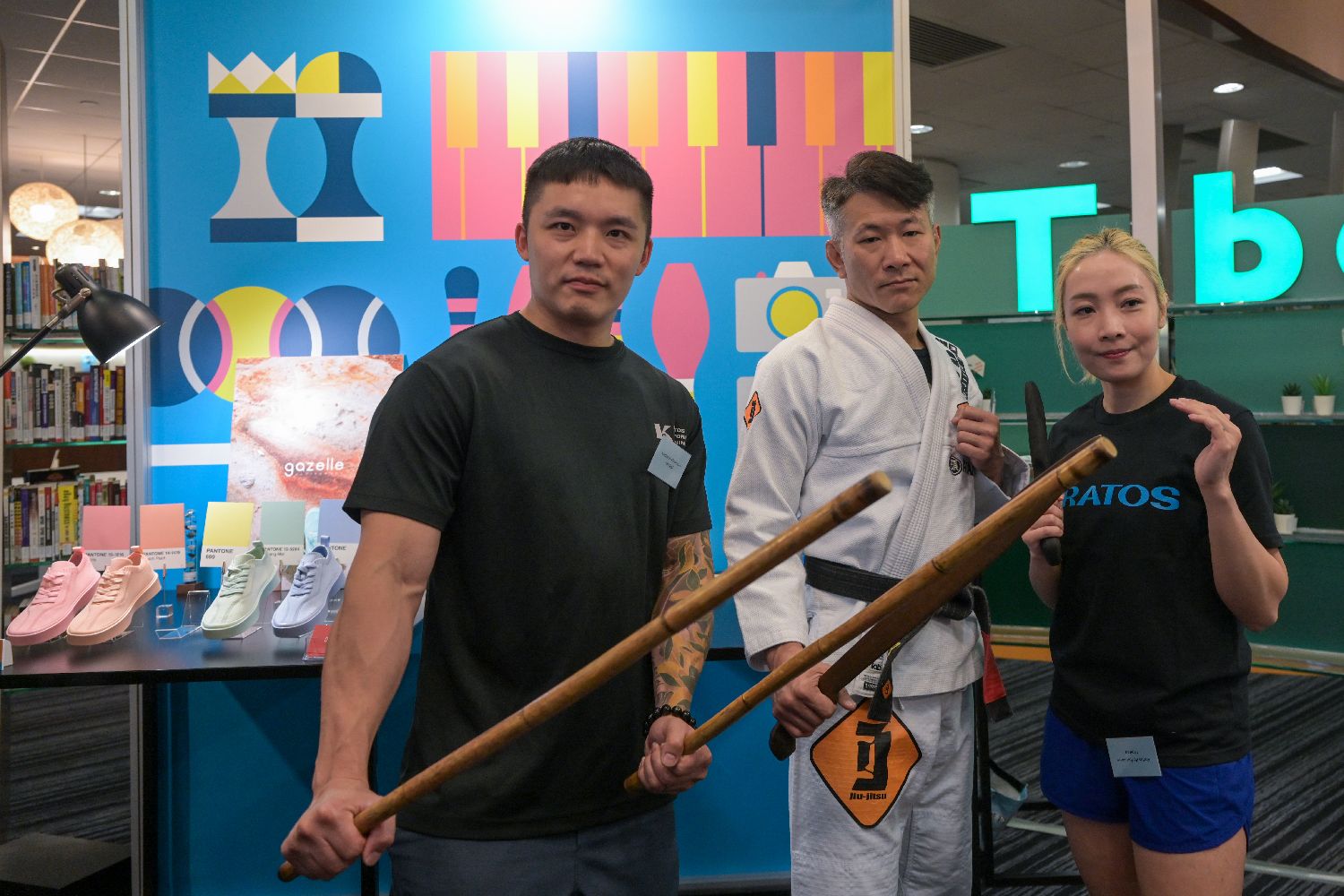 “香港运动消闲博览”参展商介绍其展位。(图片来源:中新社)