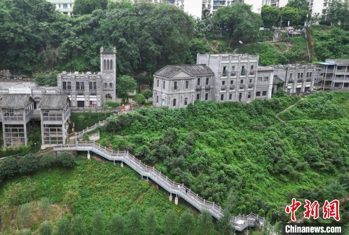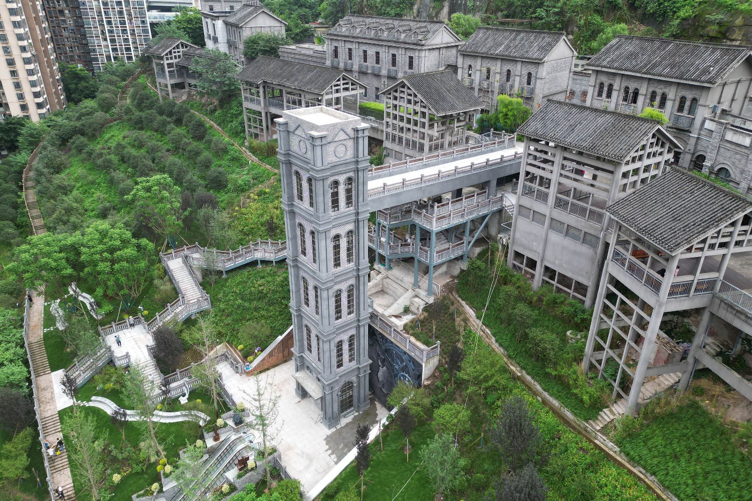 该步道位于重庆九龙坡建设医院、黄杨新城片区,起于黄杨路,途经建川博物馆抗战兵工街,止于龙腾大道上跨桥,全长约1100米。图为航拍重庆谢家湾轨道站步道。(图片来源:中新社)