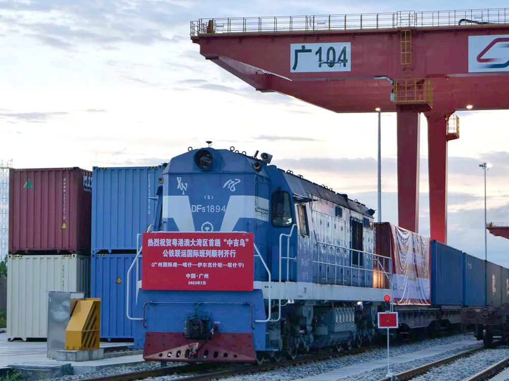 同天,粤港澳大湾区首列“中吉乌”多式联运国际班列从广铁集团广州国际港驶出,标志着从大湾区始发的“中吉乌”公铁联运国际班列正式开通运营。据介绍,该班列全程采用集装箱“铁路—公路”的国际多式联运方式,以铁路运输方式运抵新疆喀什后,再转公路从伊尔克什坦口岸出境,经吉尔吉斯斯坦,最终运抵乌兹别克斯坦塔什干。(图片来源:中新社发/广铁集团供图)