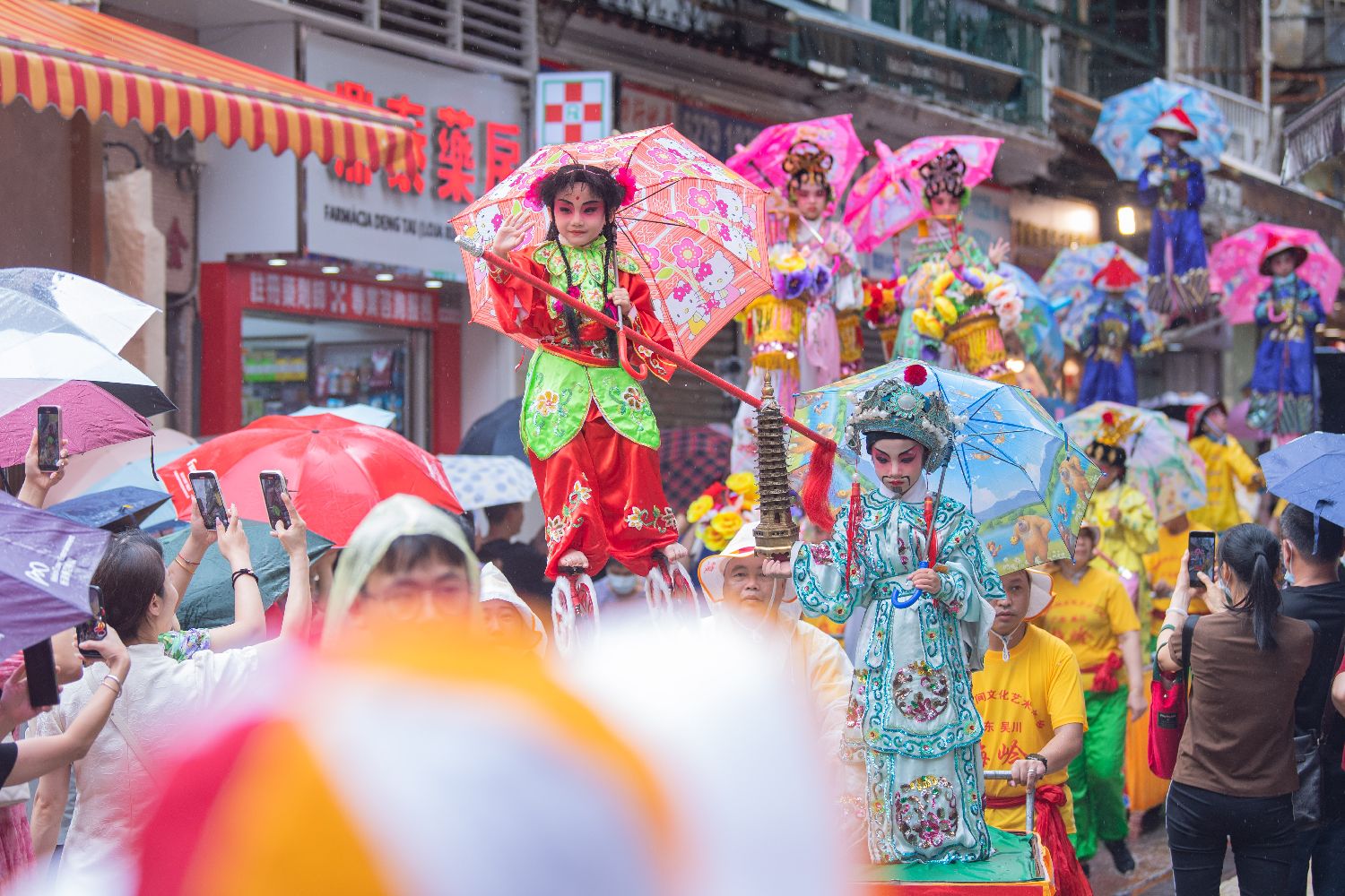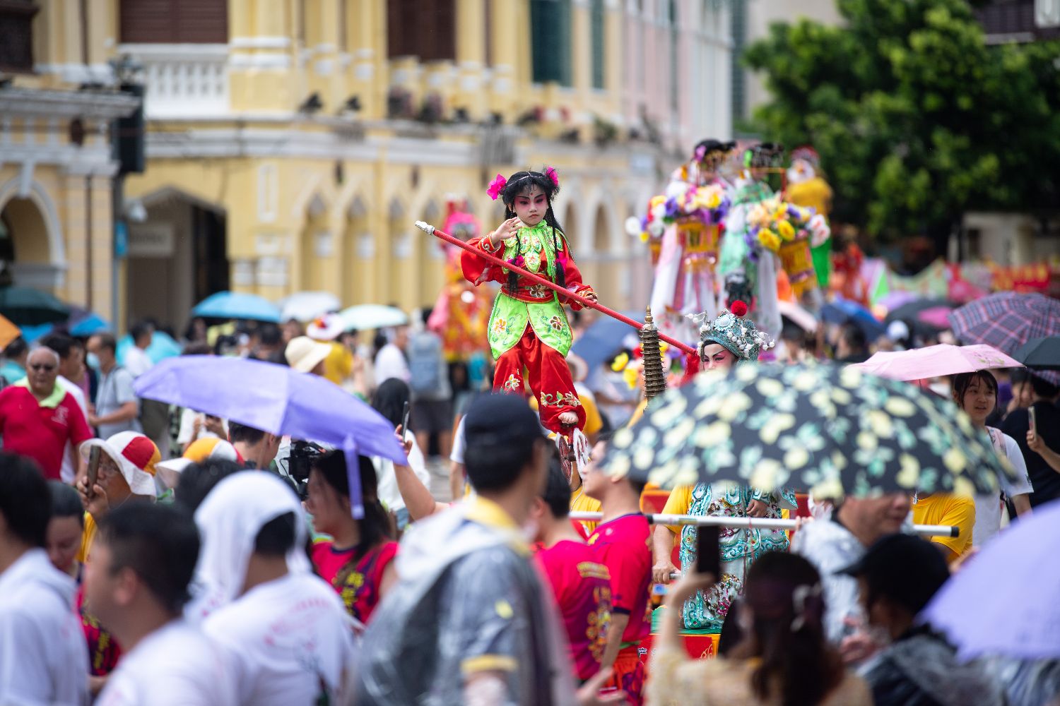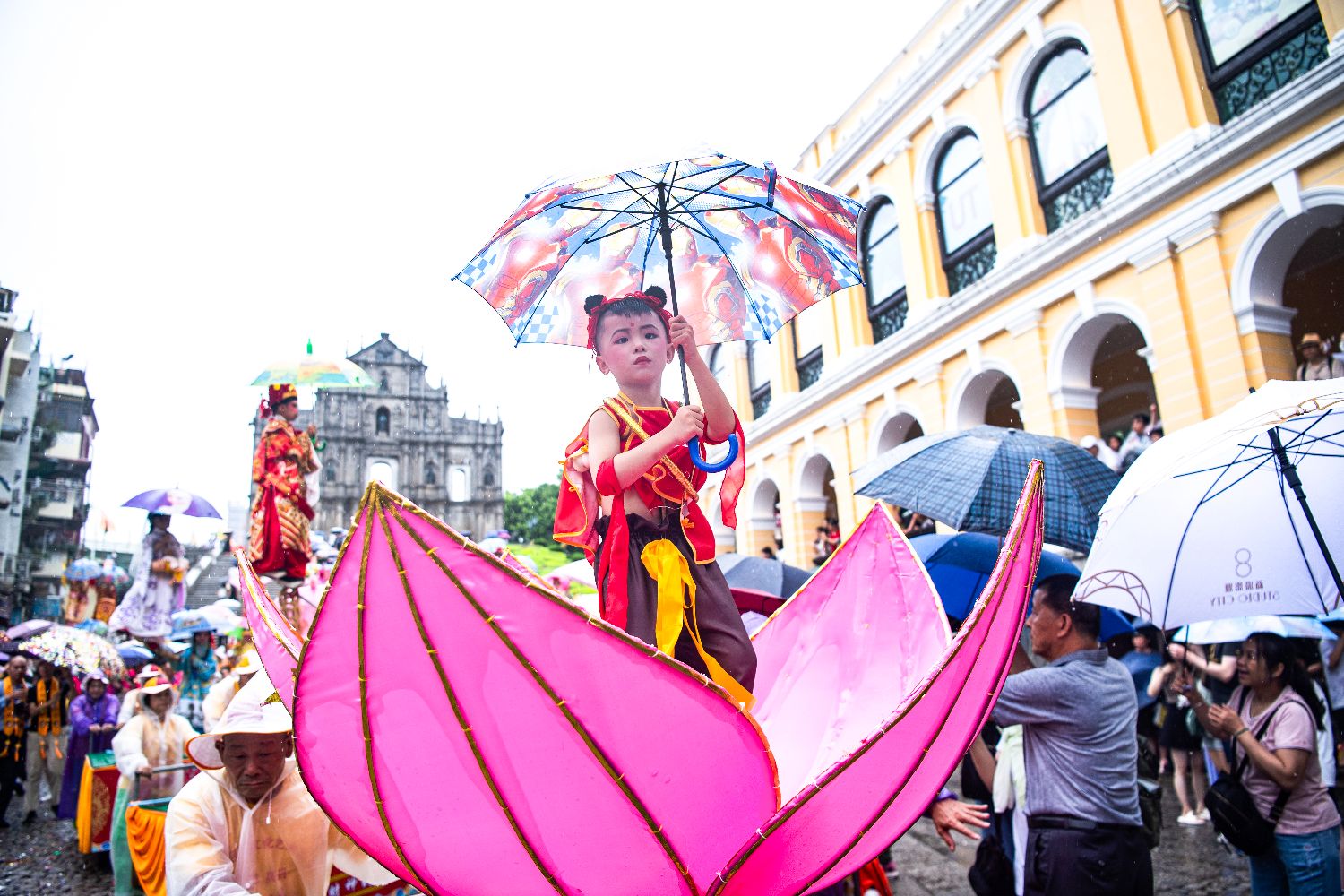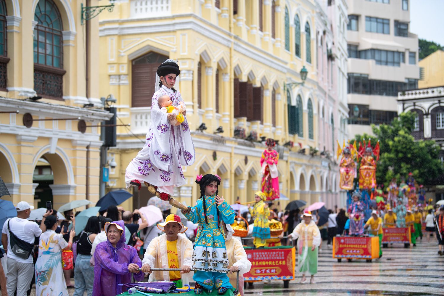 7月4日,澳门大三巴哪吒庙举办哪吒飘色巡游。农历五月十八日(7月5日)是哪吒诞,澳门气象局在当地时间4日下午一度发出黄色暴雨警告,但无碍表演者、围观市民及旅客的热情。巡游队伍自大三巴哪吒庙前地出发,途经大三巴街、议事亭前地、花王堂前地等。