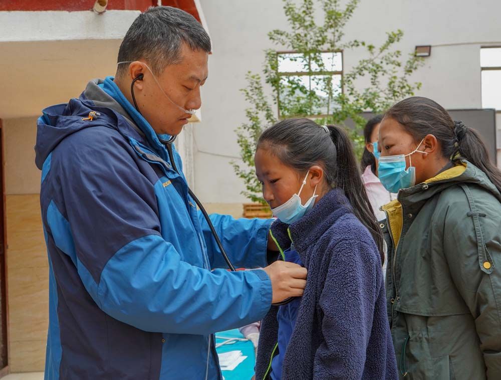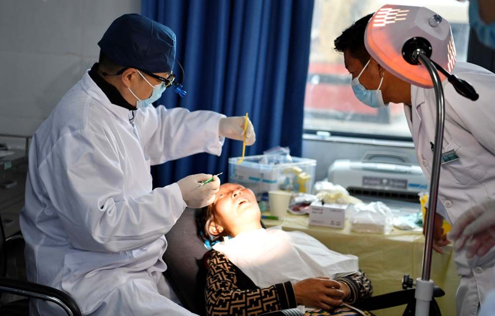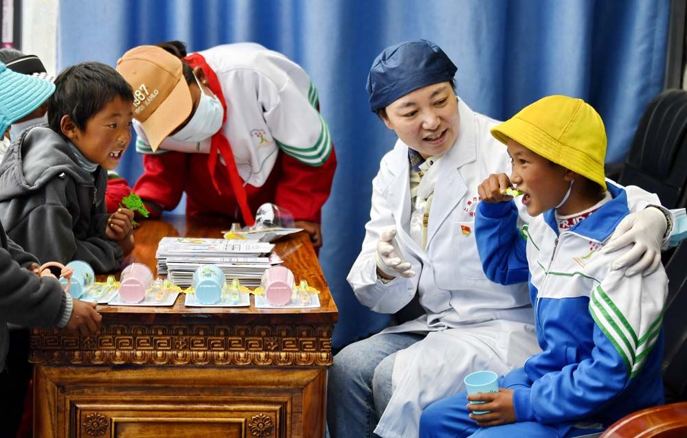 普玛江塘乡海拔5373米,是中国海拔最高的乡。图为7月8日,上海市徐汇区牙病防治所医生苏红如为小朋友补牙。