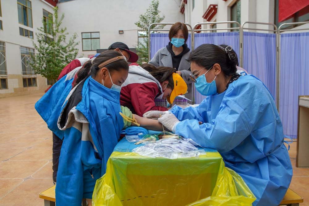 7月4日,“心佑工程”项目团队医生给患儿抽血检查。当日,由南京医科大学第二附属医院发起的“心佑工程”项目团队来到西藏那曲,对0至18岁儿童和青少年展开先天性心脏病筛查工作。