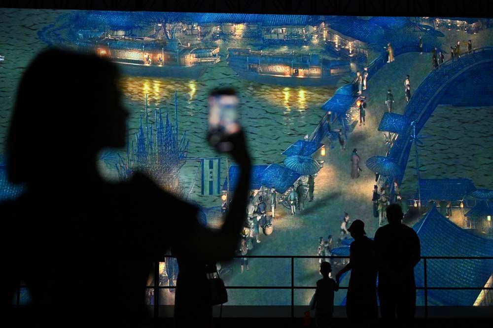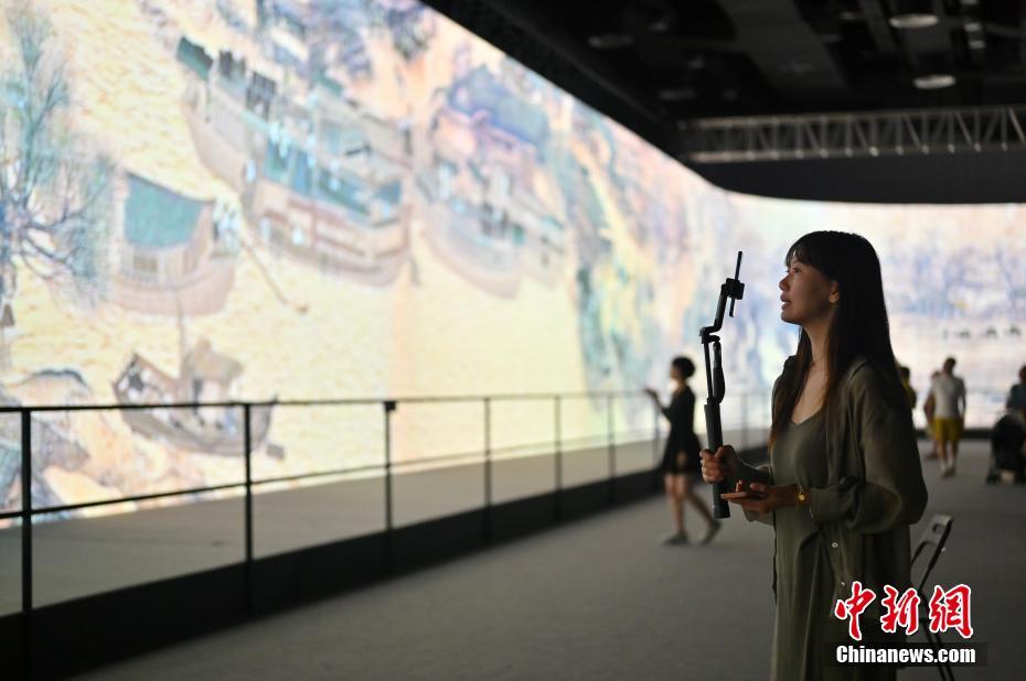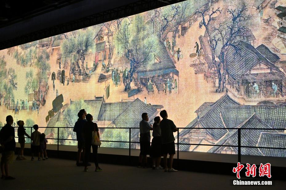 7月9日,广西南宁,市民参观在南宁国际会展中心展出的“会动的《清明上河图》展览”。此次展览以北宋画家张择端所绘《清明上河图》为蓝本,通过巨幕荧屏将原作放大数百倍,复原上千个画中人物,再现北宋时期的繁华盛景。(图片来源:中新社)