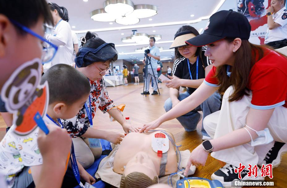 为进一步科普船舶知识,传播航海文化,7月11日,上海主题活动“船艇开放”在上海港国际客运中心码头举行。“海巡01”轮、“申城之光”轮和“雪龙2”号在此集中停靠,供市民参观。图为上海海上搜救志愿者总队志愿者在“申城之光”轮上,教市民急救知识。(图片来源:中新网)