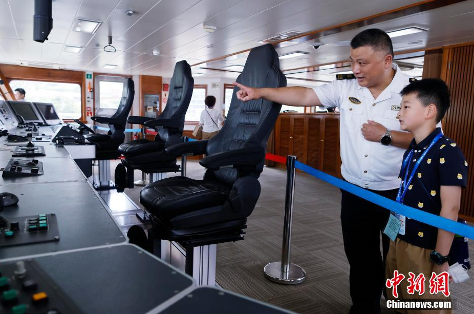 7月11日,上海主题活动“船艇开放”在上海港国际客运中心码头举行。图为海事工作人员在“海巡01”轮上,向孩子介绍驾驶室内的设备。(图片来源:中新网)