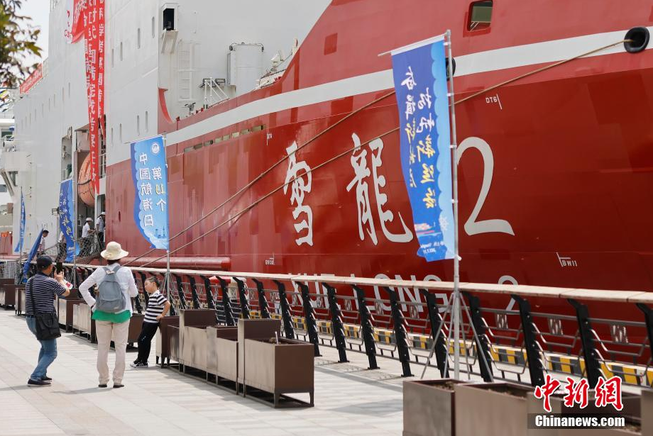 7月11日,上海主题活动“船艇开放”在上海港国际客运中心码头举行。图为孩子在“雪龙2”号船边合影。(图片来源:中新网)