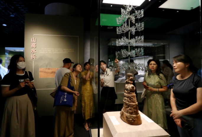 7月10日,“江海共潮生:长江与海洋文明·考古文物精品展”在位于上海的中国航海博物馆开幕。图为参观者在东汉摇钱树展柜前驻足观看。(图片来源:新华社)