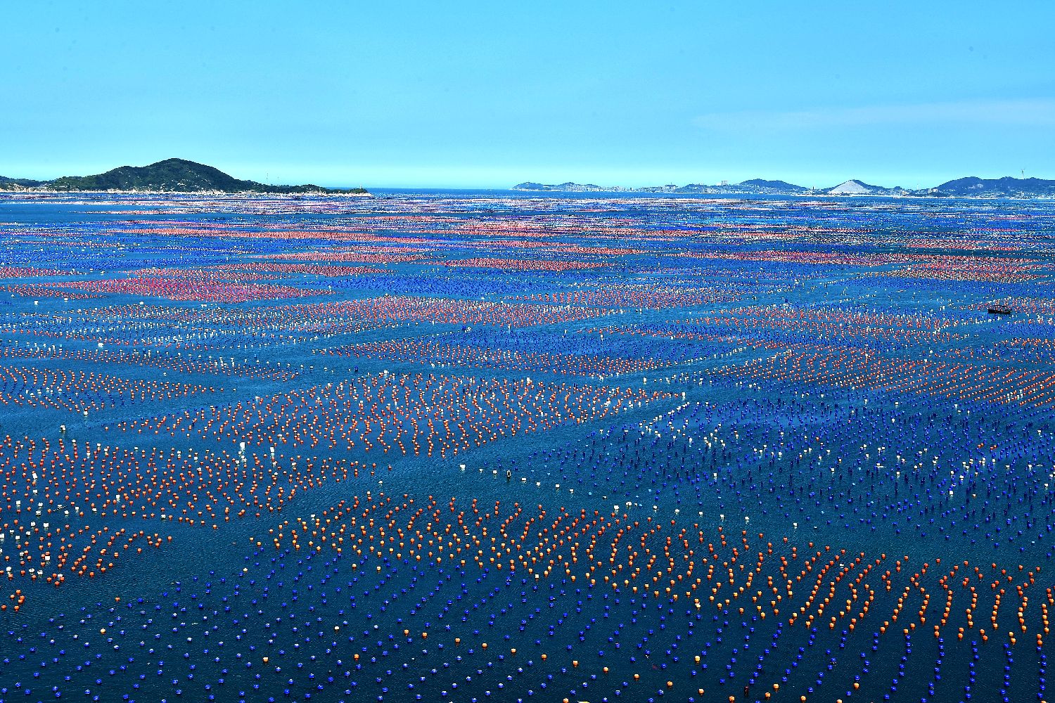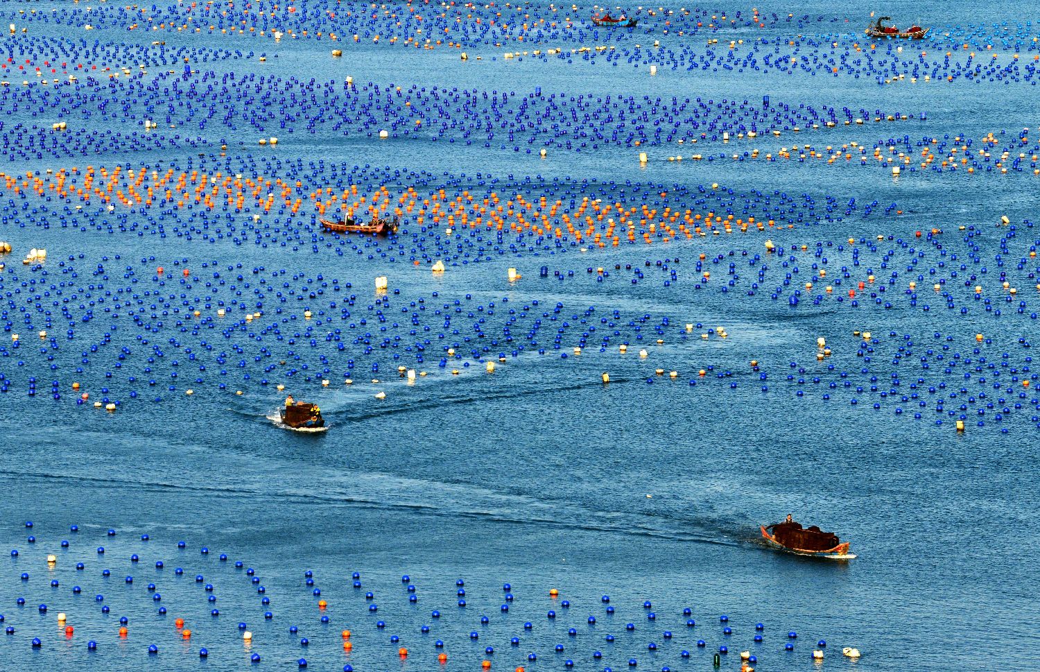 7月11日,在连江县松芦湾海域的800多公顷鲍鱼养殖基地,一笼笼养殖的鲍鱼纵横交错。(图片来源:中新社)