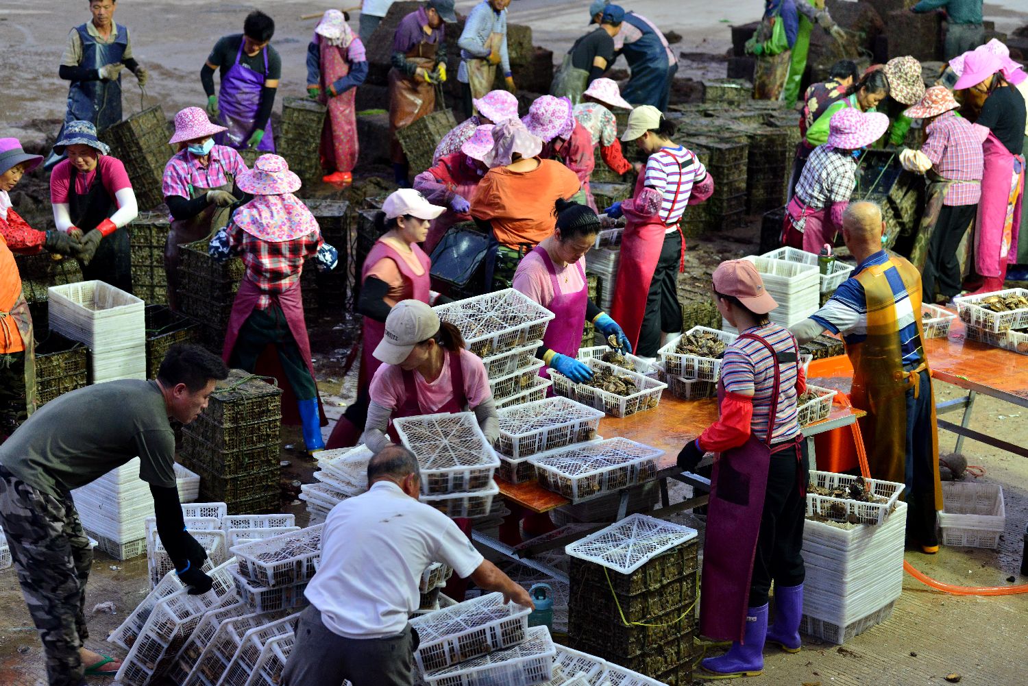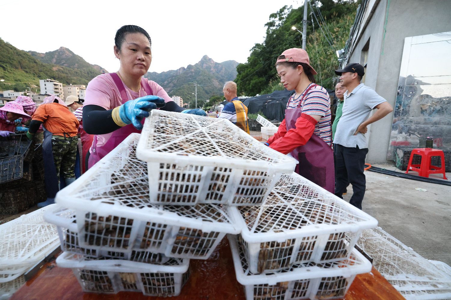7月11日,在连江县下宫镇松芦湾码头,渔民们分拣、清洗、打包鲍鱼。(图片来源:新华社)