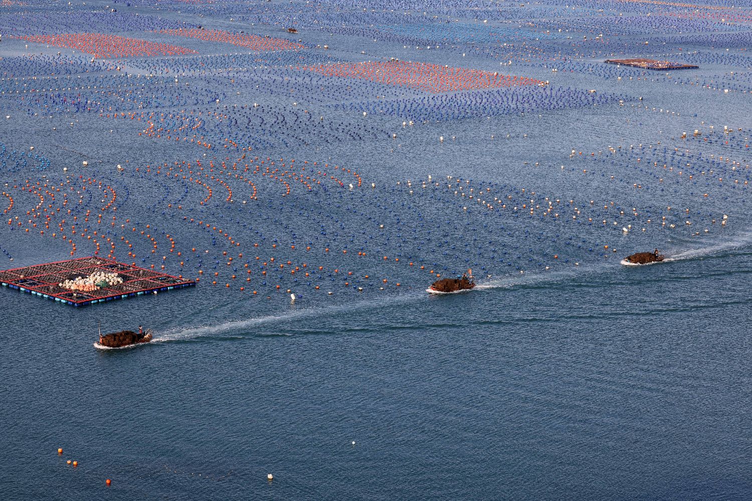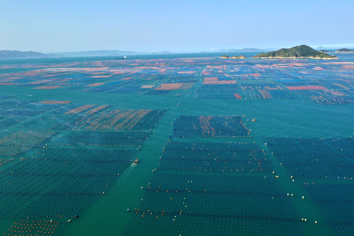 7月11日,连江县下宫镇松芦湾海域,渔民驾驶渔船穿梭在海上牧场。(图片来源:新华社)