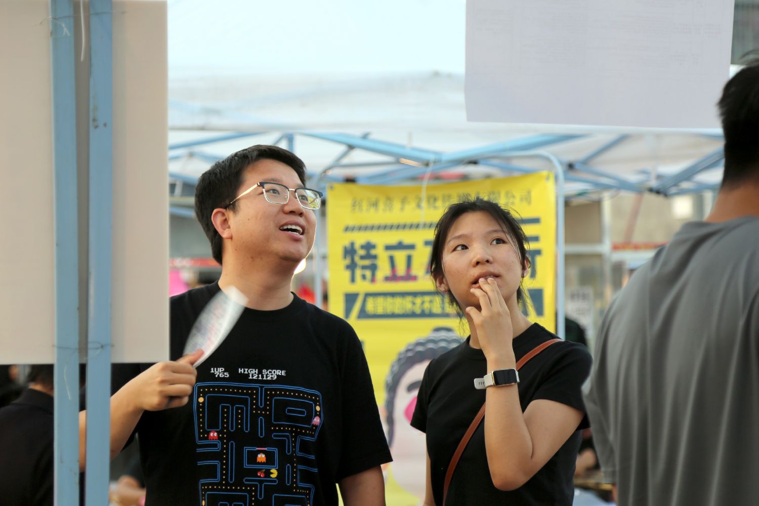 7月15日晚,求职者在云南省红河哈尼族彝族自治州蒙自市大树寨的“青年人才夜市”招聘会现场查看岗位信息。(图片来源:新华社)
