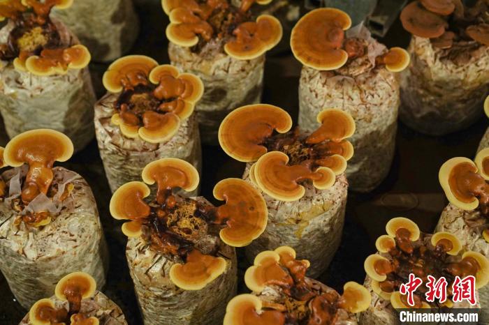 近日,广西贵港市港北区大圩镇永福村食用菌基地,灵芝长势喜人。(图片来源:中新网)