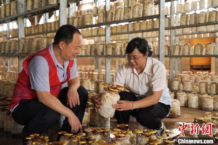 近日,广西贵港市港北区大圩镇永福村食用菌基地,只见满棚的灵芝个头饱满、形状各异,长势喜人,技术人员在介绍灵芝的生长情况。(图片来源:中新网)