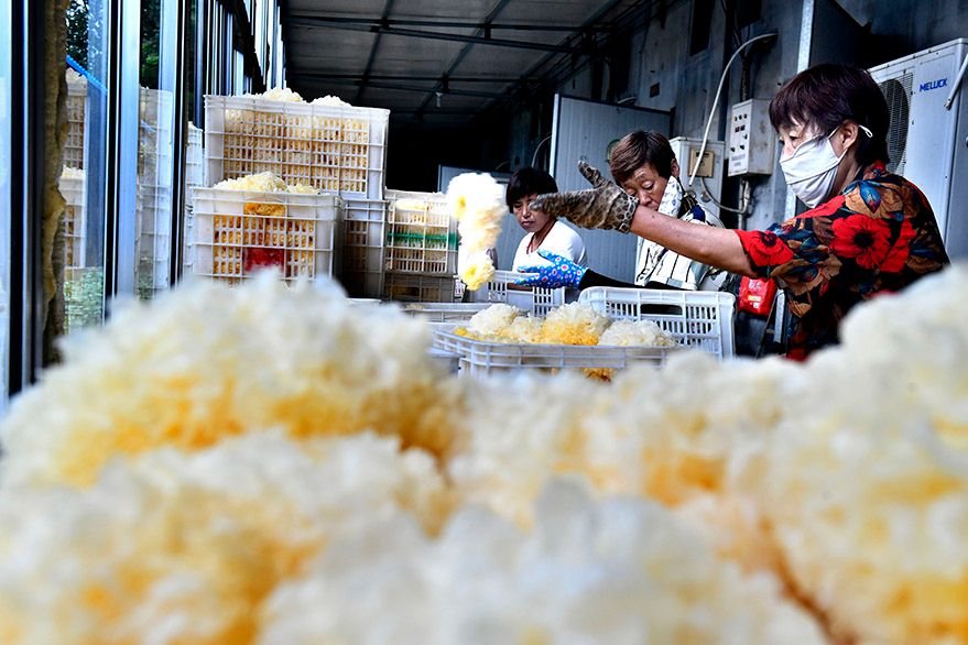 7月15日,在胡集镇银丰食用菌种植合作社,工作人员在整理新采摘的银耳。(图片来源:新华社)