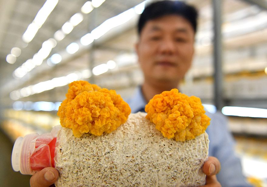 7月2日,在位于河南省夏邑县车站镇的蓝天食用菌产业园种植车间,技术人员展示他们种植的金耳。(图片来源:中新社)