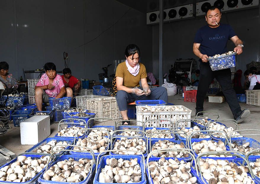7月2日,在位于河南省夏邑县李集镇的天祥食用菌产业园,工人们整理刚刚采摘的草菇。(图片来源:中新社)