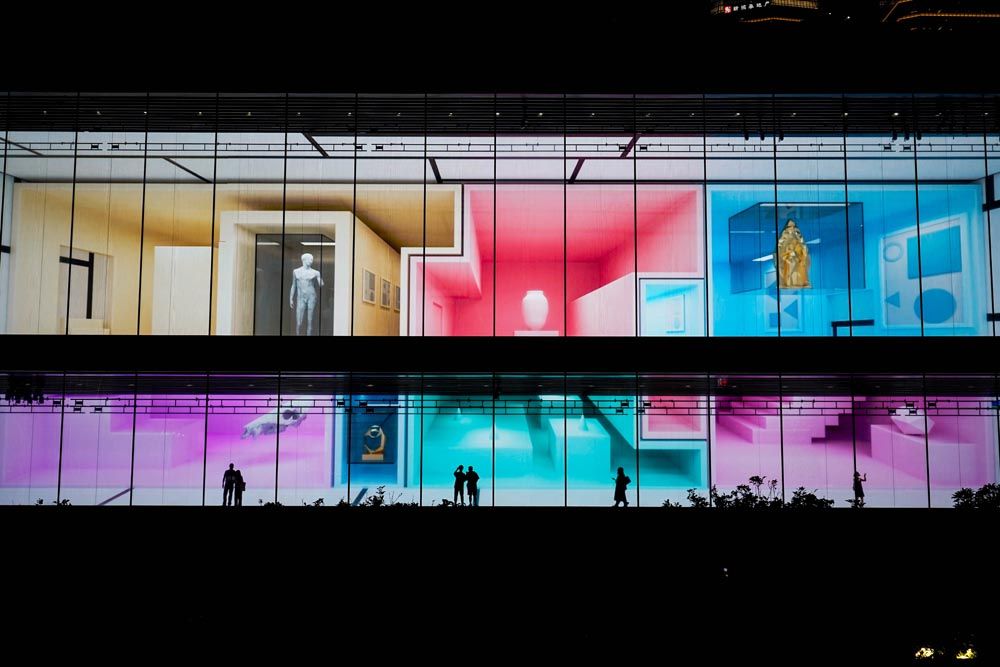 7月13日拍摄的浦东美术馆镜厅灯光秀。(图片来源:新华社)