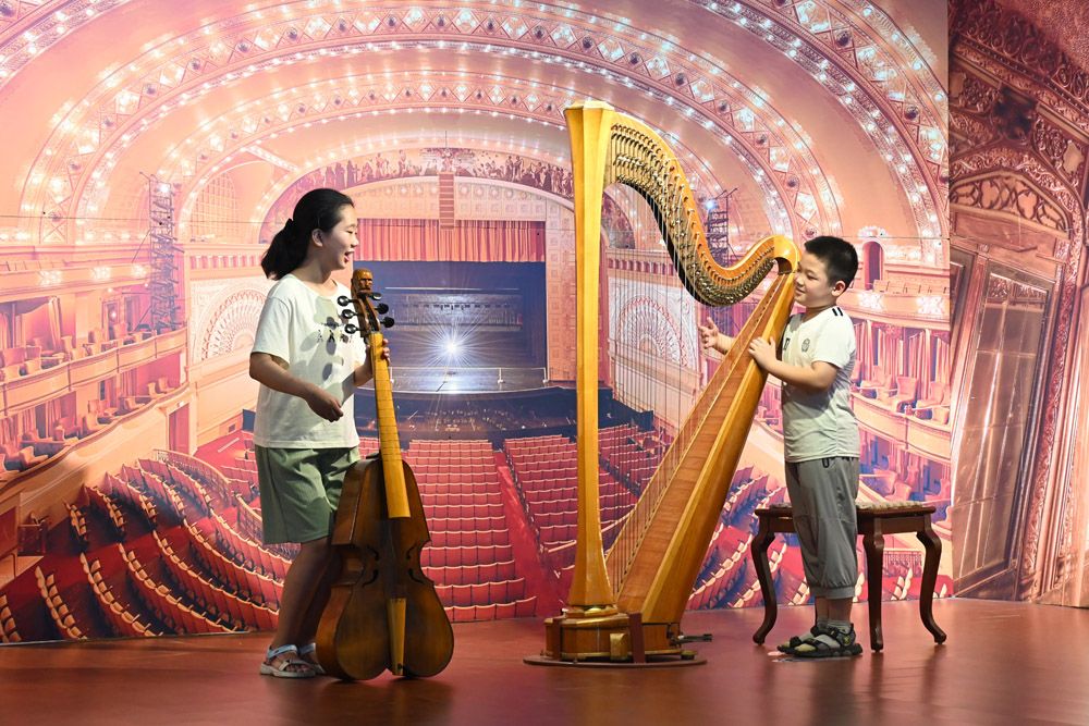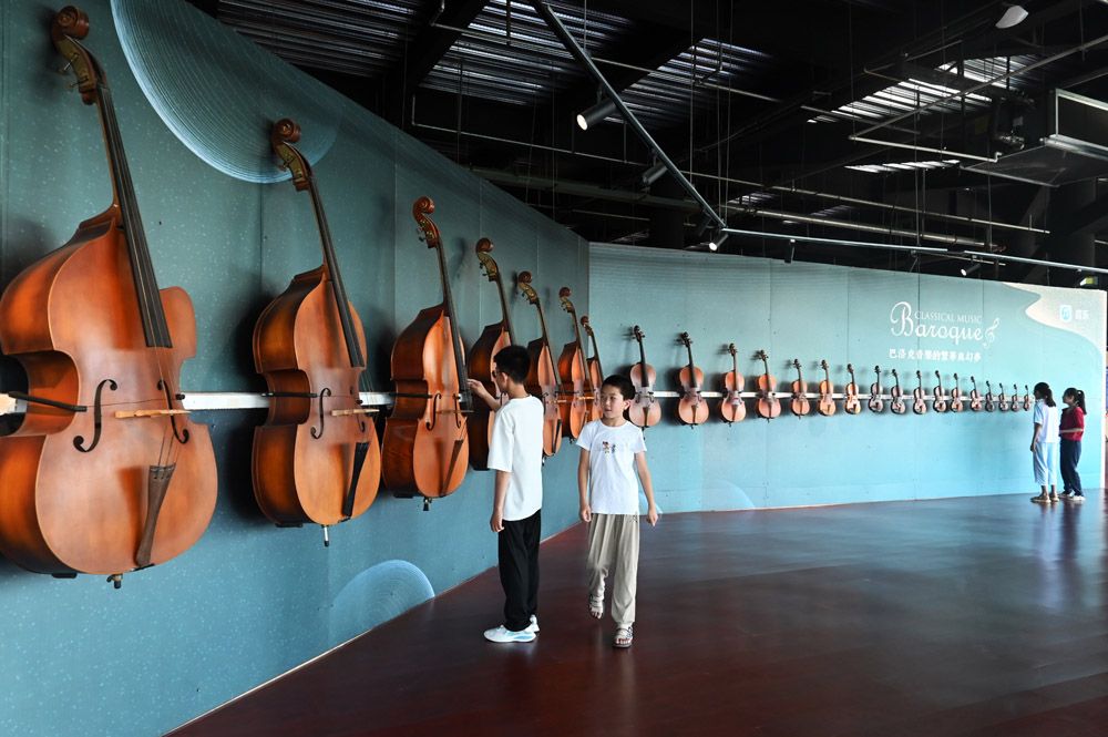 7月5日,河北省衡水市武强县周窝音乐小镇,孩童在“世界·乐器博物馆”提琴家族展区参观。暑假来临,该博物馆迎来“打卡”热。(图片来源:中新社)