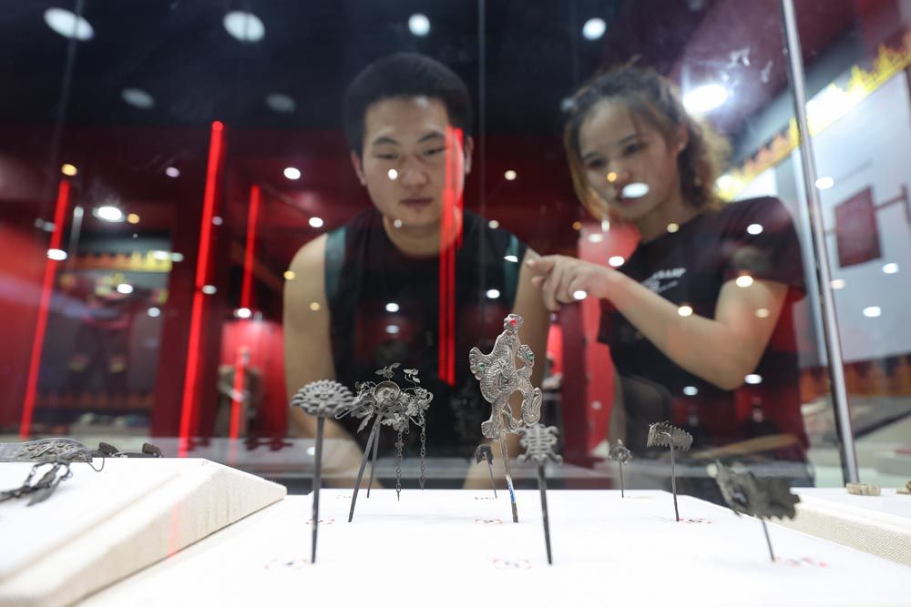 7月13日,奢香博物馆展出的彝族头饰吸引参观者。奢香博物馆位于贵州省毕节市大方县,是以奢香夫人命名的彝族历史文化综合馆,博物馆仿造古代彝族土司庄园建筑而成,分别设有奢香主题馆、彝文古籍馆、古驿道等展区,共陈列展出各类文物一千余件。(图片来源:中新社)