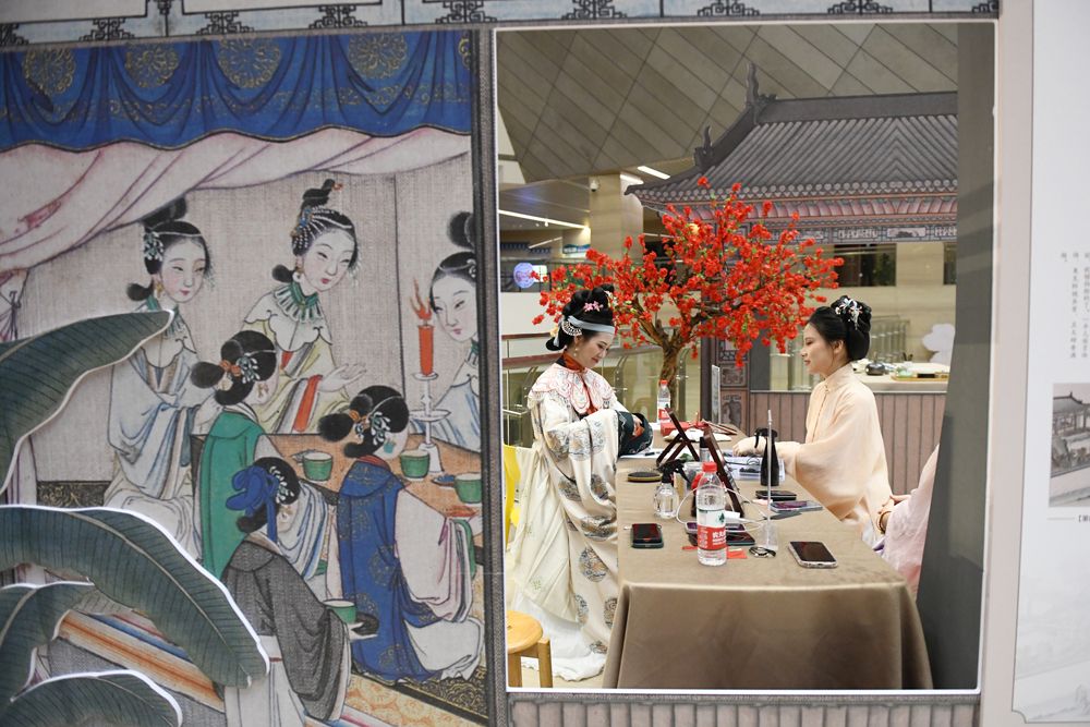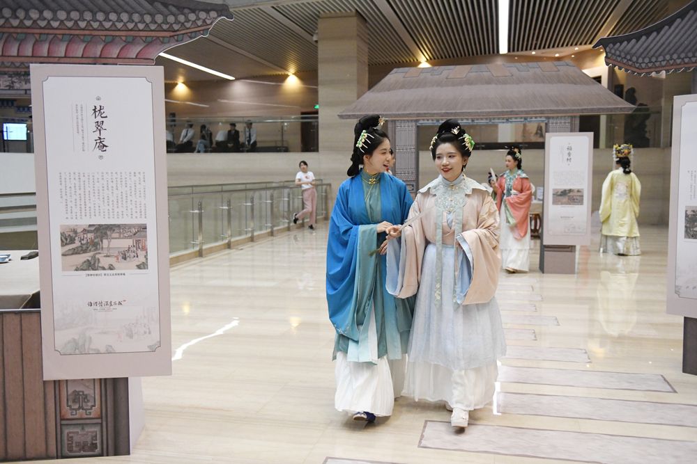 7月14日,长沙博物馆“谁谓情深画不成——清孙温、孙允谟绘《红楼梦》画册展”在长沙开幕,现场《红楼梦》爱好者装扮成画中人物进行游园。(图片来源:中新社)