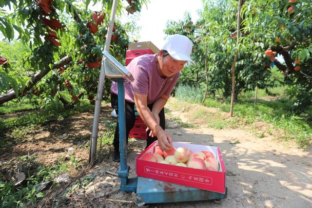 7月18日,在北京市平谷区大华山镇的一处桃园,桃农将采摘好的桃子称重。(图片来源:《北京日报》)