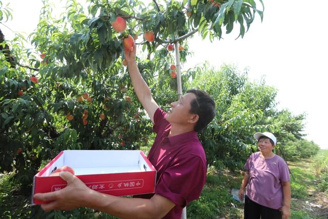 7月18日,桃农在北京市平谷区大华山镇的一处桃园采摘桃子。(图片来源:《北京日报》)